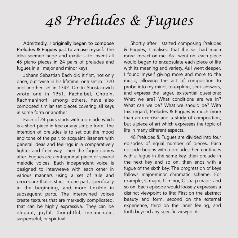 I would like to release the original composition of 48 Preludes & Fugues album by Chitpong Kittinaradorn, containing 24 pairs of preludes and fugues in all major and minor keys for piano.
